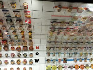 これまで発売されてきた日清食品のインスタント食品の数々に、なつかしさや新たな発見を感じながら奥へ。自分の好きなパッケージを描き、スープ・具材の組み合わせが選べるオリジナルカップヌードルを作る体験を行いました。